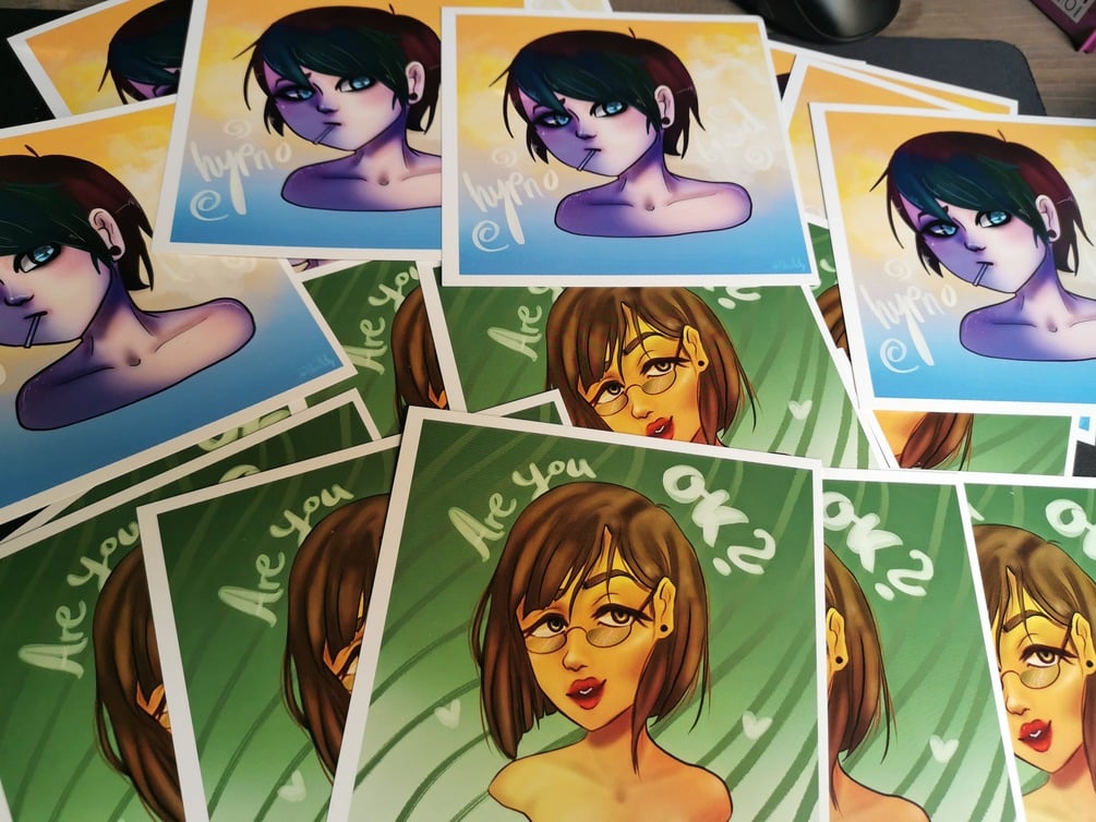 The artwork and characters are made by me. Maze is the lovely girl witch the green background and David the hypnotised one with the blue-yellow background.